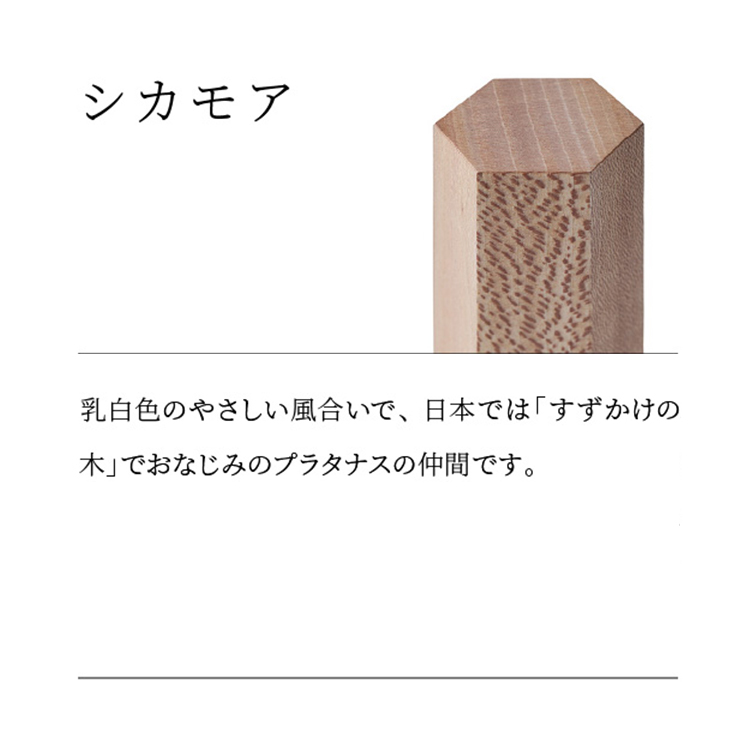 六角形の木柱部には、木目が特徴的な「神代欅」「シカモア」「ベリ」「ブビンガ」という4種の無垢材から選ぶことができます。