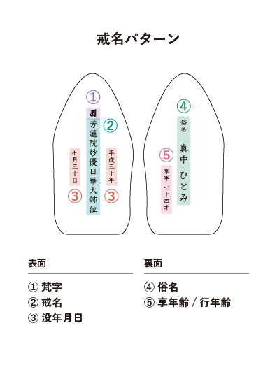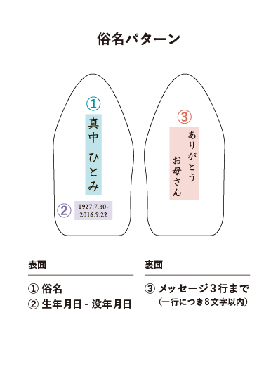 ・祈りの道具屋 まなかでは、各お位牌の特徴やサイズに適した名入れパターンをご用意しております。お位牌への名入れはこの基本パターンの中からお選びください。